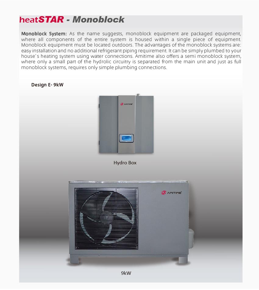 Monoblock kui mõiste tähendab et soojuspumba kõik osad on samas korpuses. Seega puudub vajadus siseosa ja välisosa vahelise külmatorustiku ühendamiseks. Monoblock mudeli paigaldus on mõistlik kui puudub võimalus külmamehhaaniku teenuse kasutamiseks. Paigaldaja peab tagama et õues asuv veetorustik on piisavalt hästi isoleeritud. Seade on täiendavalt varustatud ruumis sees asetseva hydroboxiga, milles on veepump ja juhtpult.